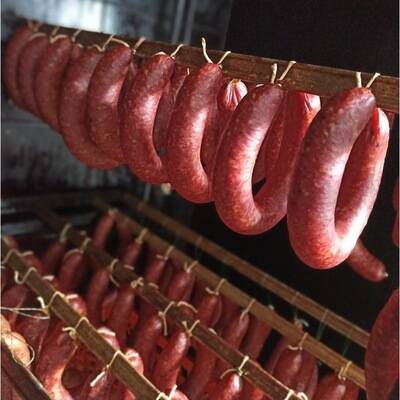 Rindfleisch 97%, Schweinespeck, Speisesalz, Gewürze, Saccharose, Dextrose, Konservierungsstoff: E252, Antioxidationsmittel E300, E301, Säuerungsmittel: E330, Schwefeldioxid/Sulfite, Buchenholzrauch